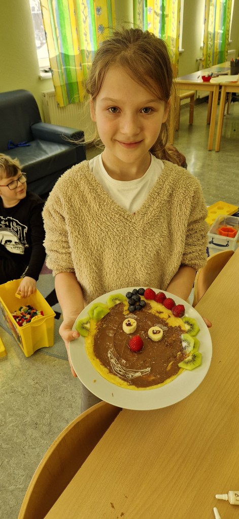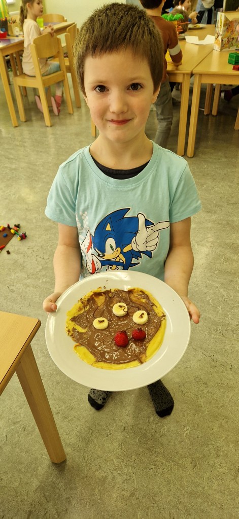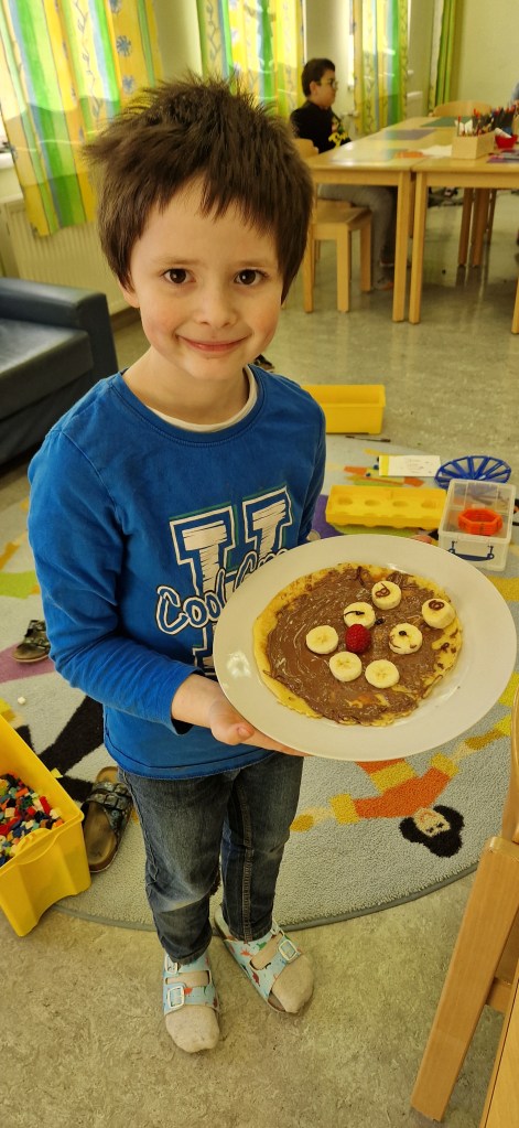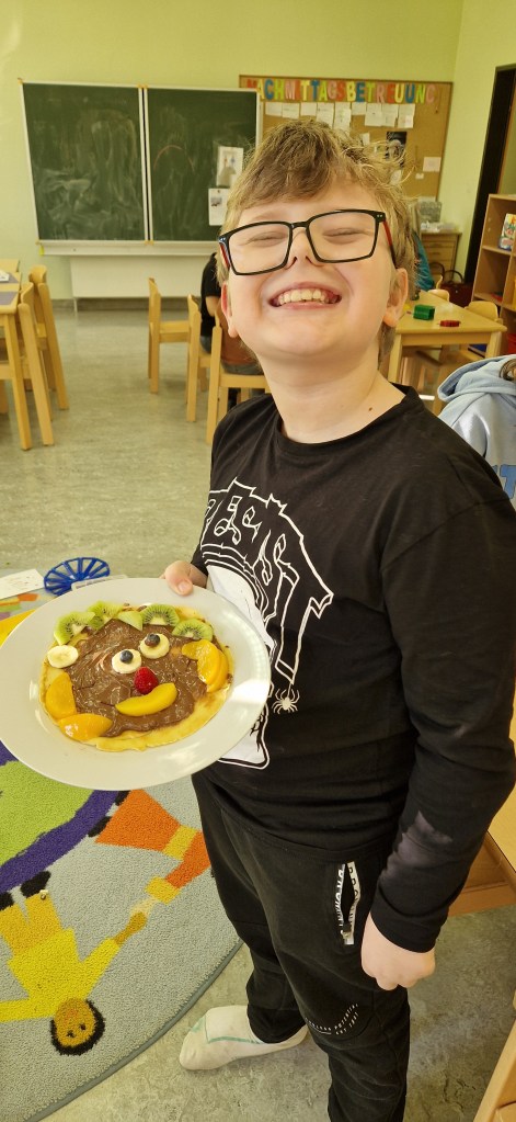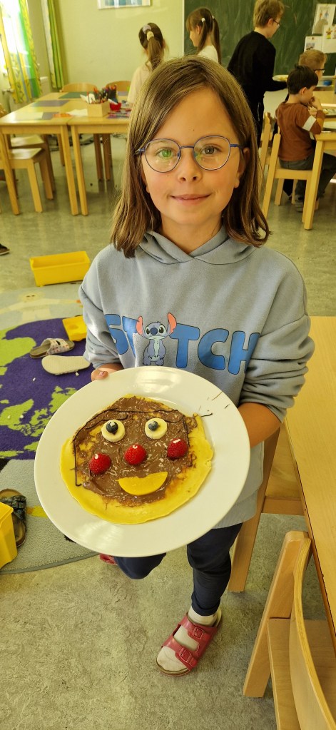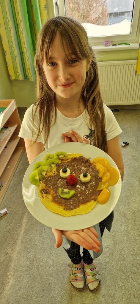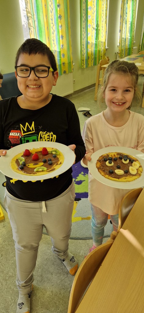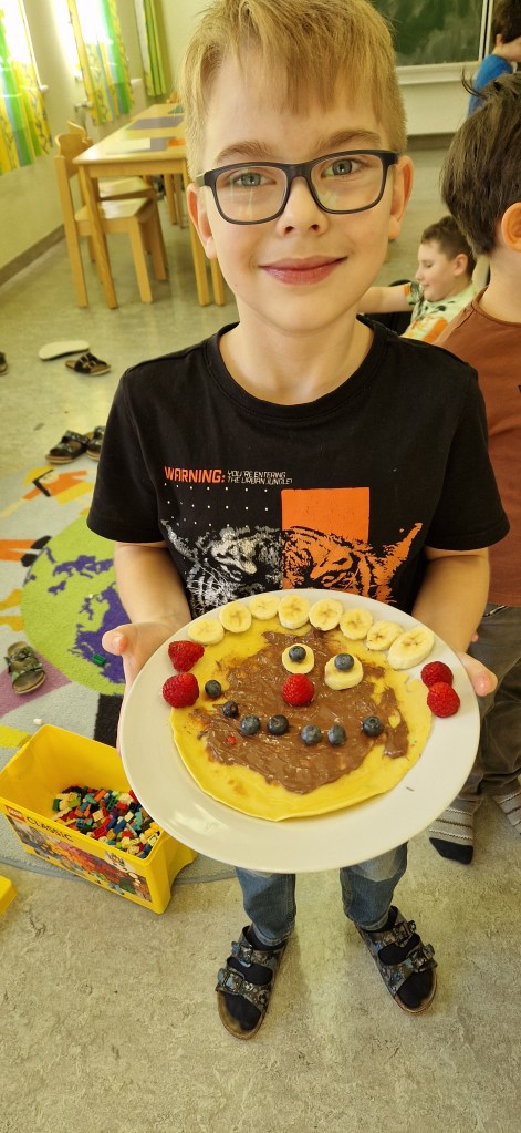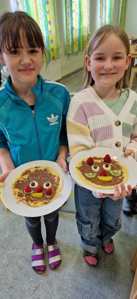 Gemeinsam mit Lukas haben wir in der Nachmittagsbetreuung lustige Palatschinken gebacken. Mit Schokocremé bestrichen und frischem Obst verziert, schmeckten sie gleich noch viel besser!