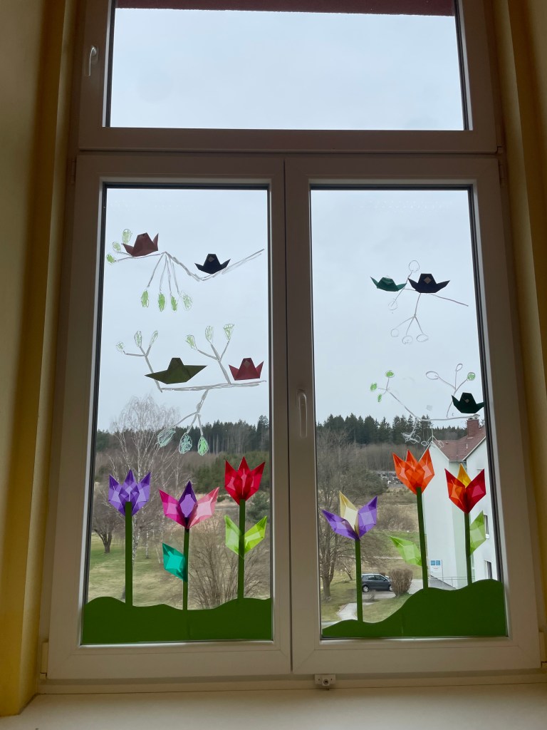 Wir holen uns den Frühling ins Klassenzimmer mit wunderschönen Tulpen aus Transparentpapier und lustigen Origami-Vögeln. Die Äste dazu haben wir mit Kreidestiften ans Fenster gemalt.