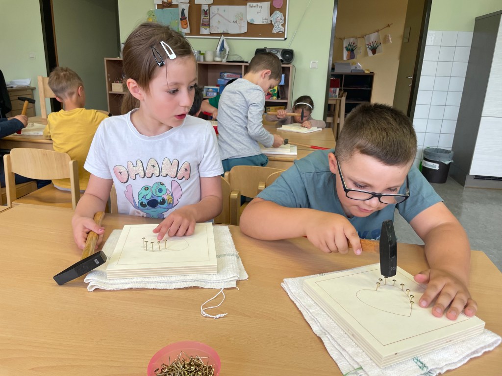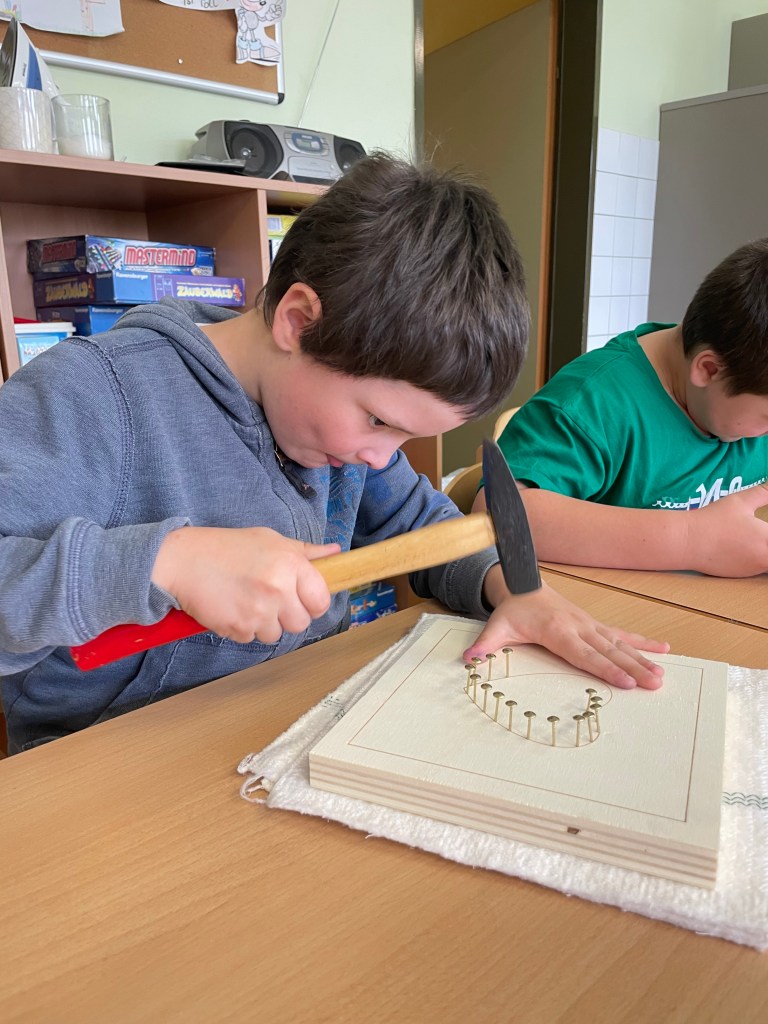 Viele kleine Nägel mussten gerade und annähernd gleich hoch eingeschlagen werden. Das forderte viel Konzentration und eine gute Hand-Auge-Koordination. Auch ein gewisses Maß an Kraft und ganz viel Ausdauer war gefragt. Anschließend wickelten wir bunte Wolle um die Nägel und erstellten eine Fadengrafik.